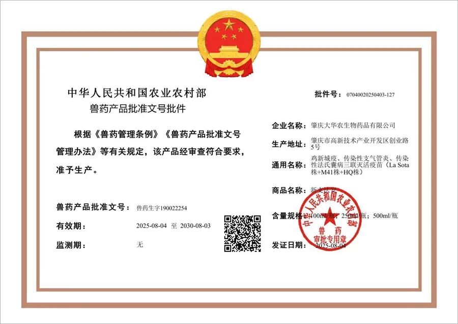 近日,肇庆大华农再传捷报!公司联合研发的“鸡新城疫、传染性支气管炎、传染性法氏囊病三联灭活疫苗(La Sota 株+M41 株+HQ 株)”于2025年8月4日获得兽药产品批准文号,兽药生字190022254,商品名:新支法安。