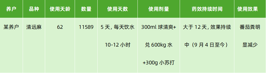 按照球清爽产品试验方案进行用药,球清爽 300ml/1200 斤水+小苏打 300g,饮水时间约 10-12h/天,连用 5 天。使用后鸡群料量无明显提升,主要表现为肠炎、西红柿粪便的改善,羽毛、鸡冠方面有改善,总体判断有一定的效果