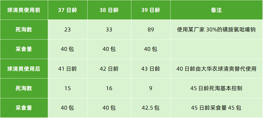 (1)死淘数:发病后连续使用磺胺氯吡嗪钠3天,死淘数在快速上升,40日龄开始用球清爽替代使用后,死淘数明显下降,连续球清爽使用5天基本得以控制