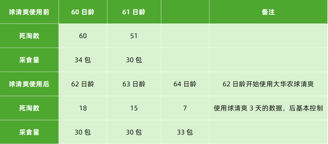 根据农场使用球清爽后的数据统计:球清爽使用第1天开始,死淘就能降下来;第3天开始采食量开始明显上升。