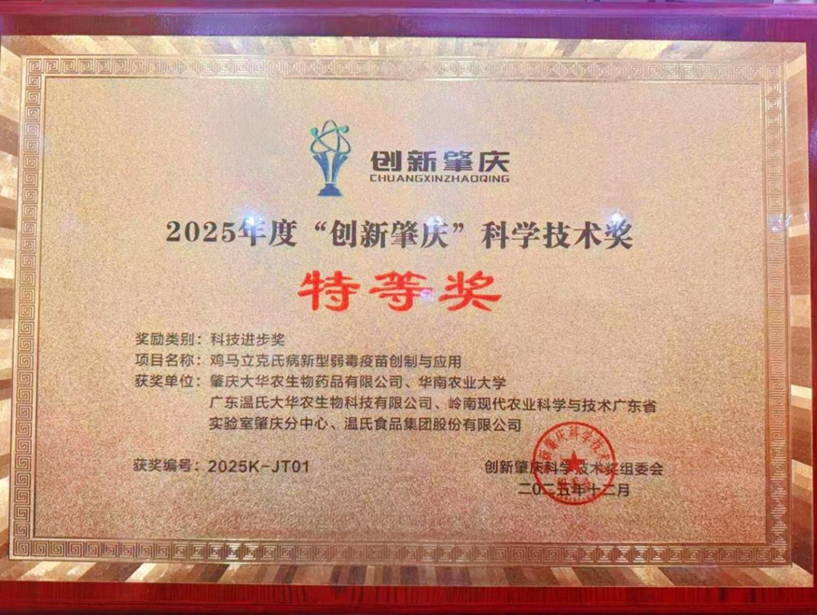 1月23日,在2025年“创新肇庆”科学技术奖暨第十八届肇庆市自然科学优秀学术论文评选总结交流会上,由大华农、华南农业大学、西江实验室、温氏食品集团股份有限公司等单位联合申报的 “鸡马立克氏病新型弱毒疫苗创制与应用” 项目,荣获2025年度“创新肇庆”科技进步特等奖。