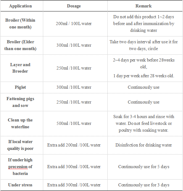 【INDICATION】It is made from several organic acid, with a patented buffer technology. The pH value can still maintain below 4.0 after it is diluted 1000 times. This product can maintain proper pH value of the gastrointestinal tract, create a good growth environment for beneficial bacteria; and promote secretion of digestive enzymes, increase the feed conversion rate, reduce the diarrhea and other infectious disease, improve animal health. It can improve the quality of drinking water as well, maintain the safety of drinking water, clean up the pipeline of drinking water system, keep the pipeline away from block.