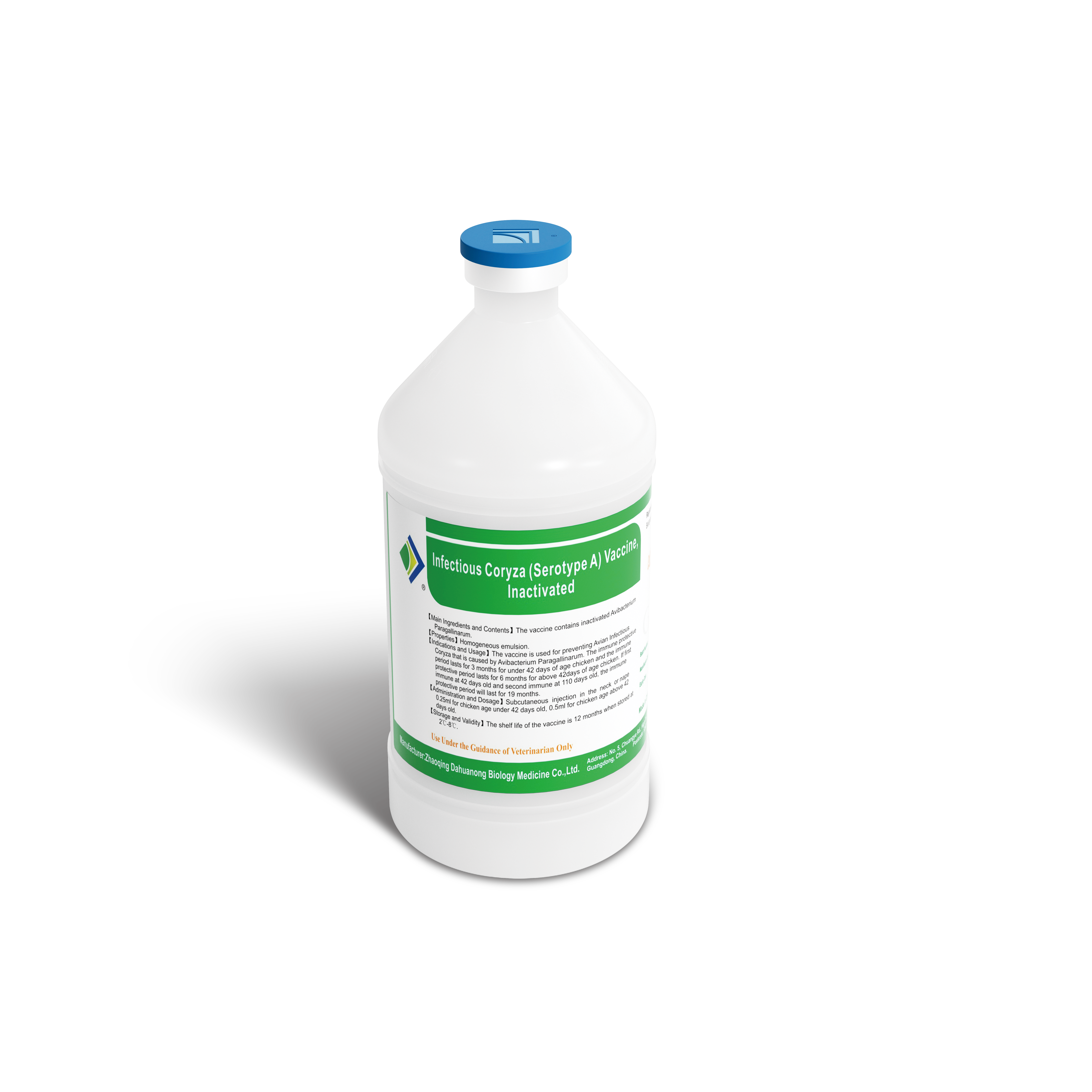 【Indication and Usage】This vaccine is used for preventing avian infectious coryza that is caused by Avibacterium paragallinarum Serotype A. The immune protective period lasts for 3 months for under 42 days of age chicken and the immune protective period lasts for 6 months for above 42 days of age chicken; if first immune at 42 days old and second immune at 110 days old, the immune protective period will last for 19 months.