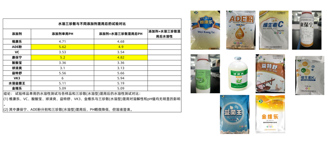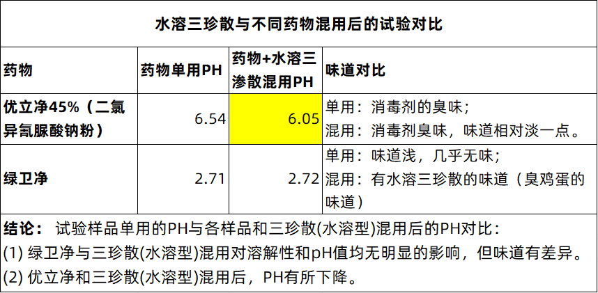 上述结果显示:三珍散(水溶型)与公司其他功能性添加剂在体外联合实验时,合在一起无变色沉淀、pH值无显著变化,说明适合与功能性添加剂联用。
