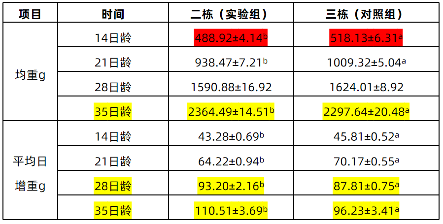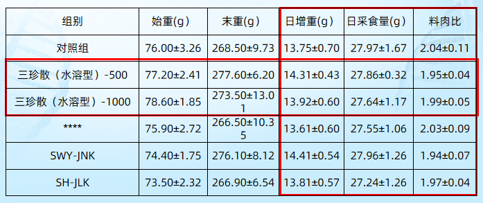 表一 三珍散(水溶型)对白羽肉鸡体增重的影响