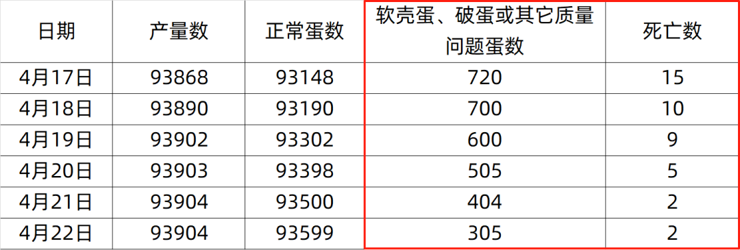 2024年4月17日至2024年4月22日,在海南某规模化蛋鸡场,10万只300日龄罗曼灰,使用三珍散(水溶型)6天。使用方法为:本产品每1000克兑水1000公斤使用,结果如下: