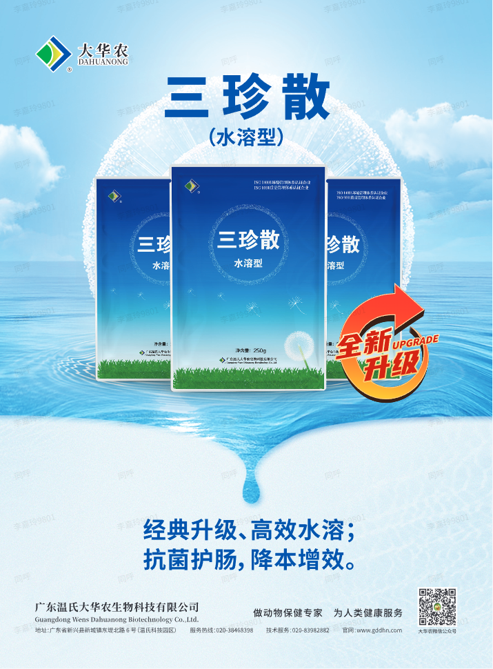 基于此背景,大华农潜心研发,创新性地开发了三珍散产品,在肠道健康和促采食方面给畜禽养殖带来了极大的帮助。同时,基于市场对肠道修复和水溶型的新需求,我们在2024年又通过先进提取工艺和特殊水溶型包被工艺,在经典三珍散产品的基础上,开发了三珍散(水溶型)产品,经典升级、高效水溶、抗菌护肠、降本增效。接下来,让我们来看看,升级版的三珍散(水溶型)产品到底有什么魔力?