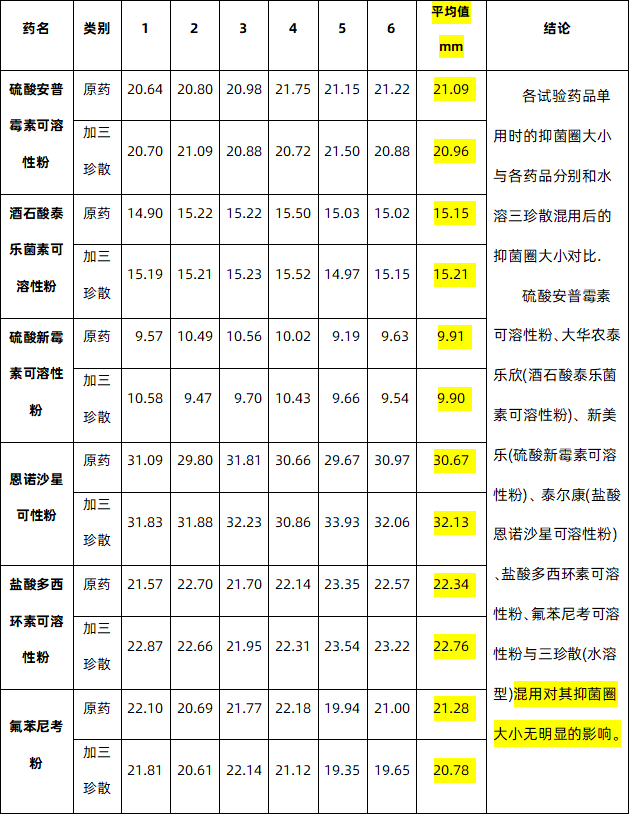 上述结果显示:三珍散(水溶型)与抗生素在体外联合实验时,合在一起无变色沉淀、pH值和抑菌圈均无明显变化,说明适合与抗生素的联用。