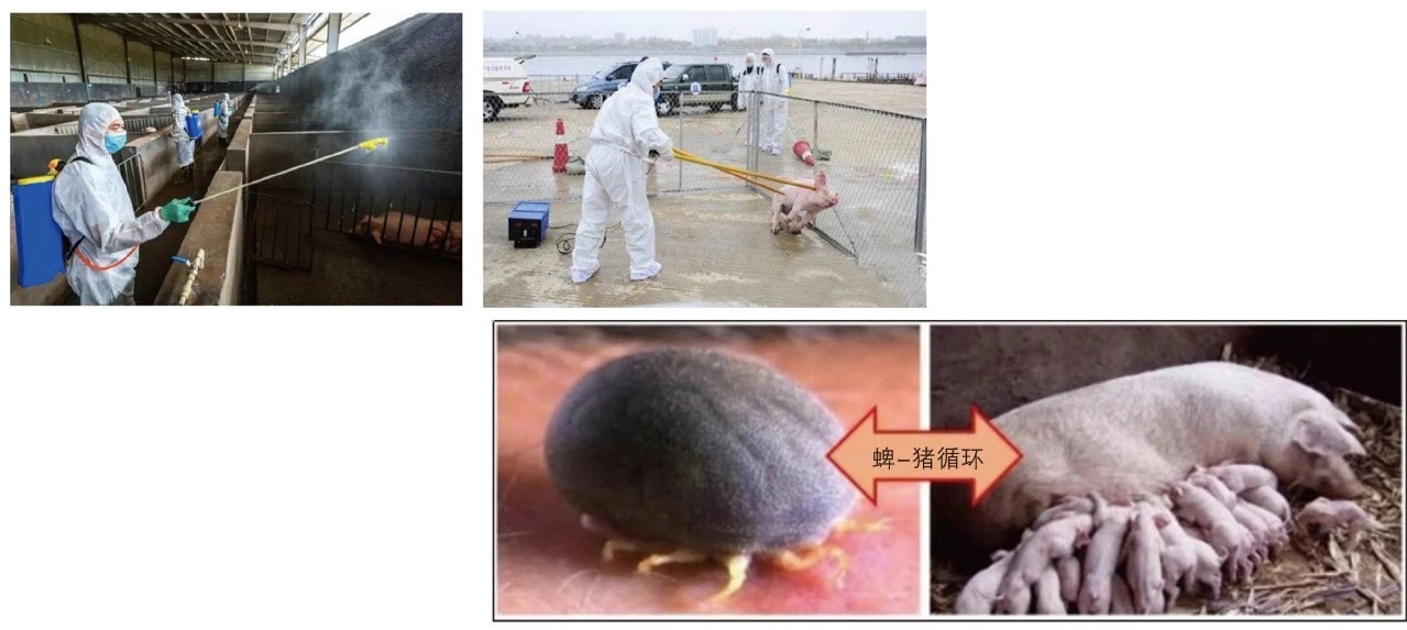 国内外尚无针对ASF的疫苗。我国是养猪大国,养猪数量在这几十年中快速增长。但该行业发展分化,一方面是传统的、小规模、自给自足的养殖方式还分散存在,另一方面是集约化、规 模化、工业化的养殖方式不断增加。这两种完全不同的养殖方式在生物安全防控方面的重视程度完全不同,前者由于生物安全重视程度低、技术落后、对动物卫生法规认识不足,对非洲猪瘟和其他疫病的入侵、传播起重要作用,截止2018年9月24日已发生的21起ASF疫情中,除1起发现于屠宰场外,全部集中于散户或小型猪场发病。后者虽然重视生物安全防控,但对国内尚未发现国外常发的疫病重视程度不够,针对性的检测措施缺失,对非洲猪瘟传播媒介——蜱的灭杀不到位,ASFV感染风险也不容忽视。ASFV经蜱传播,也是目前对我国ASF疫情防控最大威胁之一,提高生物安全防控,做好消毒和灭蜱工作,是当前切断ASFV传播途径的重要措施。